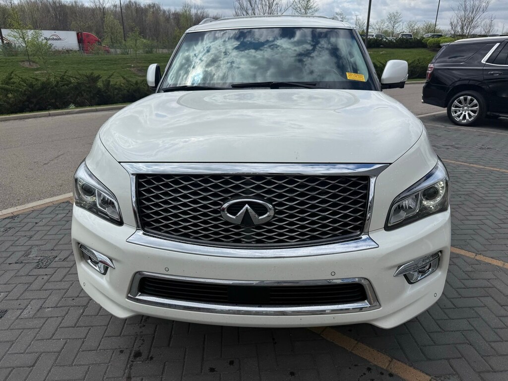 Driver's Assistance Package (Backup Collision Intervention (BCI), Blind Spot Warning, and Intelligent Cruise Control (Full-Speed Range)), Split Bench Seat Package, Theater Package (120V Power Outlet, Dual 7" Color Monitors, Heated 2nd-Row Seats, and Wireless Headphones (2)), Navigation System, 13 Speakers, 2.94 Axle Ratio, 3rd row seats: split-bench, 4-Wheel Disc Brakes, ABS brakes, Activation Disclaimer, Air Conditioning, Alloy wheels, AM/FM radio: SiriusXM, Anti-whiplash front head restraints, Auto High-beam Headlights, Auto tilt-away steering wheel, Auto-dimming door mirrors, Auto-dimming Rear-View mirror, Auto-leveling suspension, Automatic temperature control, Bose Premium Sound System, Brake assist, Bumpers: body-color, Carpeted Cargo Mat/Cargo Net & First Aid Kit, CD player, Delay-off headlights, Driver door bin, Driver vanity mirror, Dual front impact airbags, Dual front side impact airbags, Electronic Stability Control, Emergency communication system: INFINITI Connection, Four wheel independent suspension, Front anti-roll bar, Front Bucket Seats, Front Center Armrest, Front dual zone A/C, Front fog lights, Front reading lights, Fully automatic headlights, Garage door transmitter: HomeLink, Genuine wood console insert, Genuine wood dashboard insert, Genuine wood door panel insert, Heated door mirrors, Heated Front Bucket Seats, Heated front seats, Heated steering wheel, Illuminated entry, Leather Shift Knob, Leather steering wheel, Leather-Appointed Seats w/Mocha Burl Trim, Literature Kit, Low tire pressure warning, Memory seat, Occupant sensing airbag, Outside temperature display, Overhead airbag, Overhead console, Panic alarm, Passenger door bin, Passenger vanity mirror, Power door mirrors, Power driver seat, Power Liftgate, Power moonroof, Power passenger seat, Power steering, Power windows, Radio data system, Rain sensing wipers, Rear air conditioning, Rear anti-roll bar, Rear audio controls, Rear reading lights, Rear seat center armrest, Rear window defroster, Rear window wiper, Reclining 3rd row seat, Remote keyless entry, Roof rack: rails only, Roof Rail Crossbars, Security system, Special Paint - Pearl White, Speed control, Speed-sensing steering, Split folding rear seat, Spoiler, Steering wheel memory, Steering wheel mounted audio controls, Tachometer, Telescoping steering wheel, Tilt steering wheel, Traction control, Trip computer, Turn signal indicator mirrors, Variably intermittent wipers, Voltmeter, and Wheels: 20" Split 6-Spoke Aluminum-Alloy. Recent Arrival!